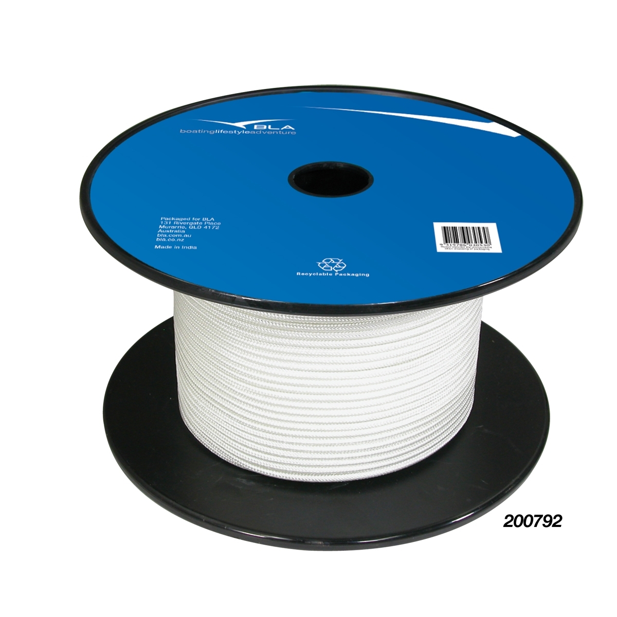 White polyester, plaited hard lay. Offers high strength and good abrasion resistance. Supplied in 100m flanged reels.