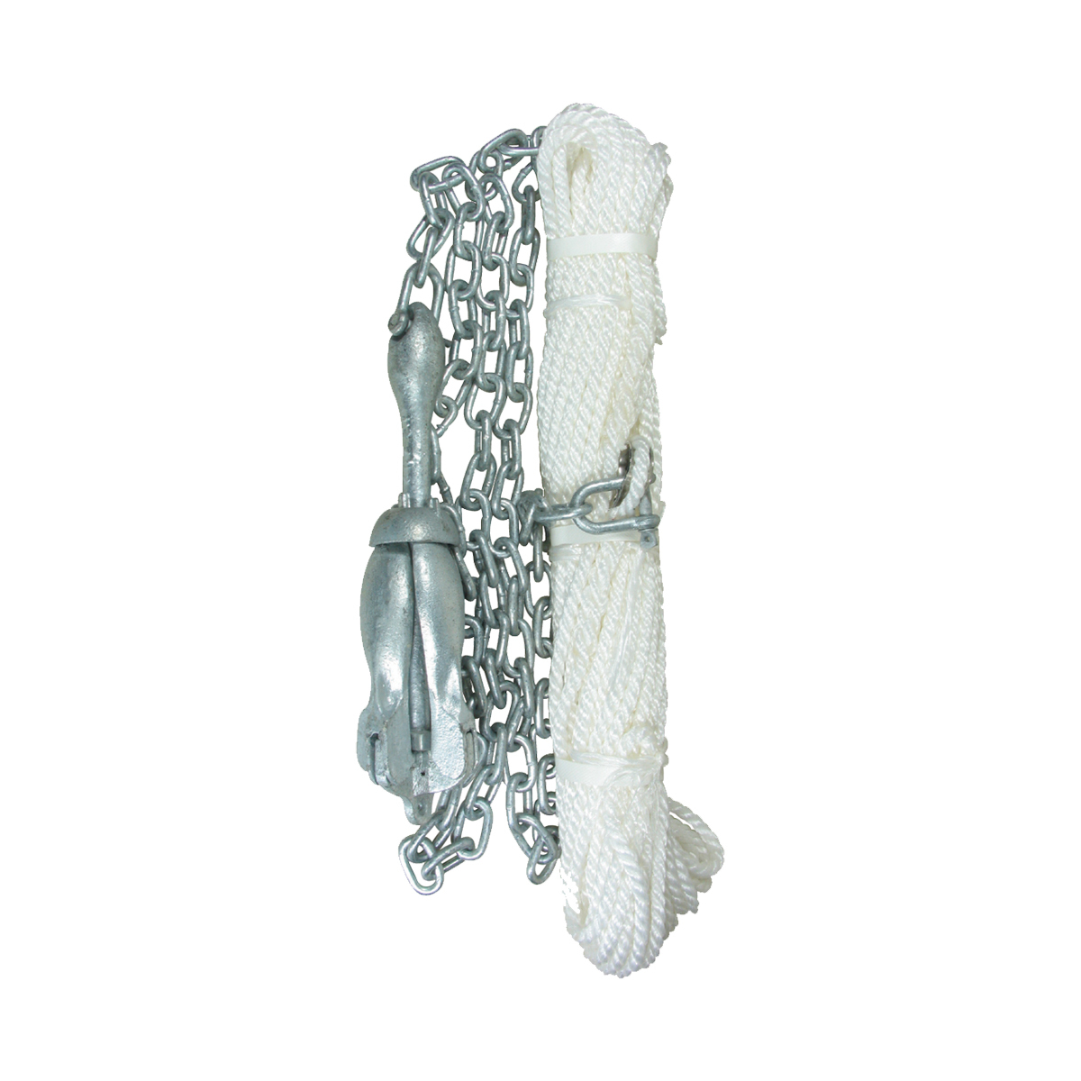 Complete anchoring kit comprising of a galvanised folding anchor, two metres of galvanised chain, two galvanised ‘D’ shackles and silver rope with a stainless steel thimble spliced in one end. Supplied in clear shrink wrapped plastic.
