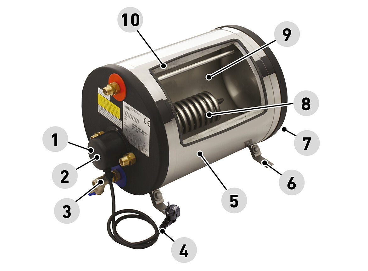 1. Electrical heating elements are available in Incoloy at 500 & 1200 Watts allowing hot water production when engine heat is not available